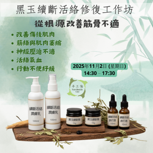 #筋骨活絡 #椎間盤突出 #神經痛 #漢方 #跌打酒 #手腳冰冷 #復健 #工作坊 #黑玉續斷